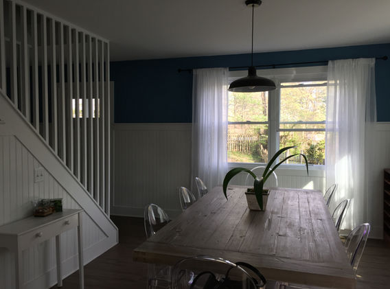 Reemplazamos las alfombras y el linóleo en toda la casa con pisos de vinilo. En la sala de estar, agregamos una ventana y un tablero de cuentas en las paredes. Derribamos el muro del hueco de la escalera al segundo piso, agregando listones verticales que le dan a la casa una sensación más abierta, conectando la sala y el comedor.